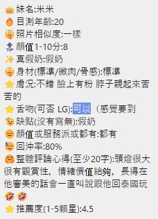 2S+500(60分)、顏射+500、口爆+500、口爆吞精+1000、攝影+1000(不露臉)、攝影+2000(露臉)、無套外射+1000、無套內射+2000
