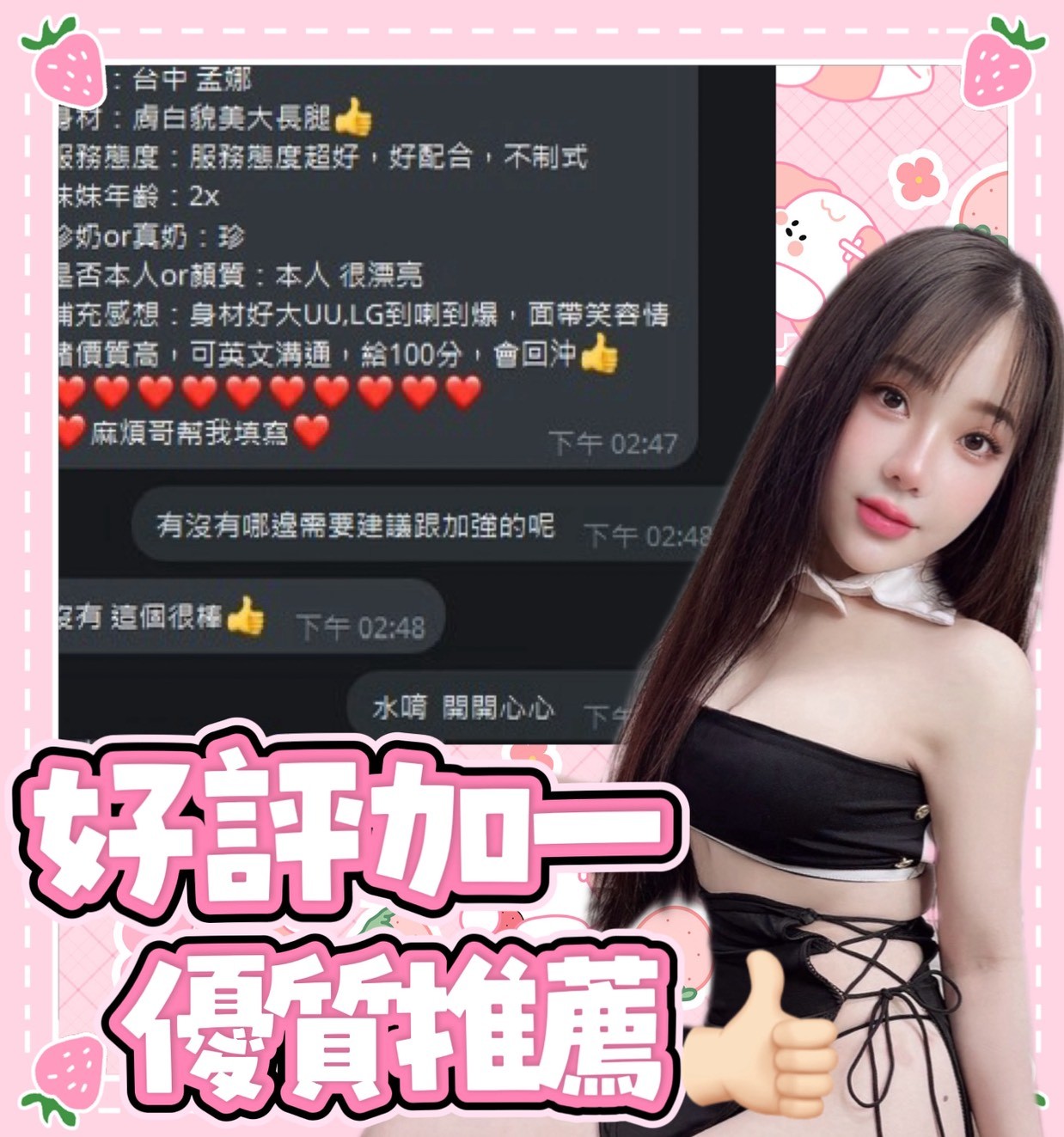 2S+500(60分)、口爆+500、顏射+500、自慰秀+500、口爆吞精 +1000、攝影+2000(不露臉)